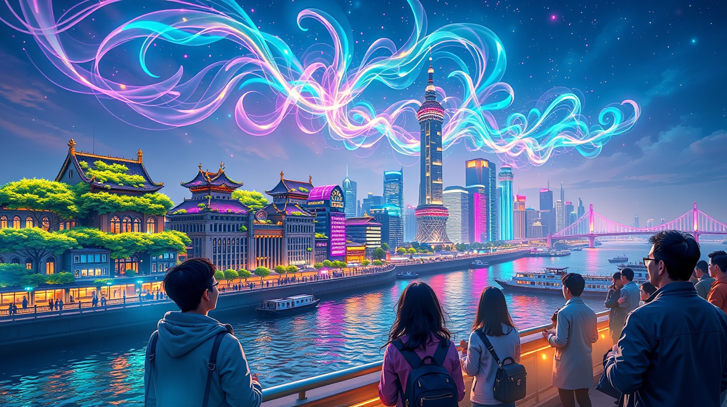 作图提示词:A stunning view of the Shanghai Bund at night, illuminated by vibrant quantum moss covering historical buildings. Citizens with joyful expressions admire a dynamic display of holographic lights in the sky, showcasing a harmonious blend of technology and nature. The scene captures the ecstatic atmosphere with colorful light flows and an energetic mood, viewed from an aerial perspective with dynamic lighting enhancing the vibrant colors.