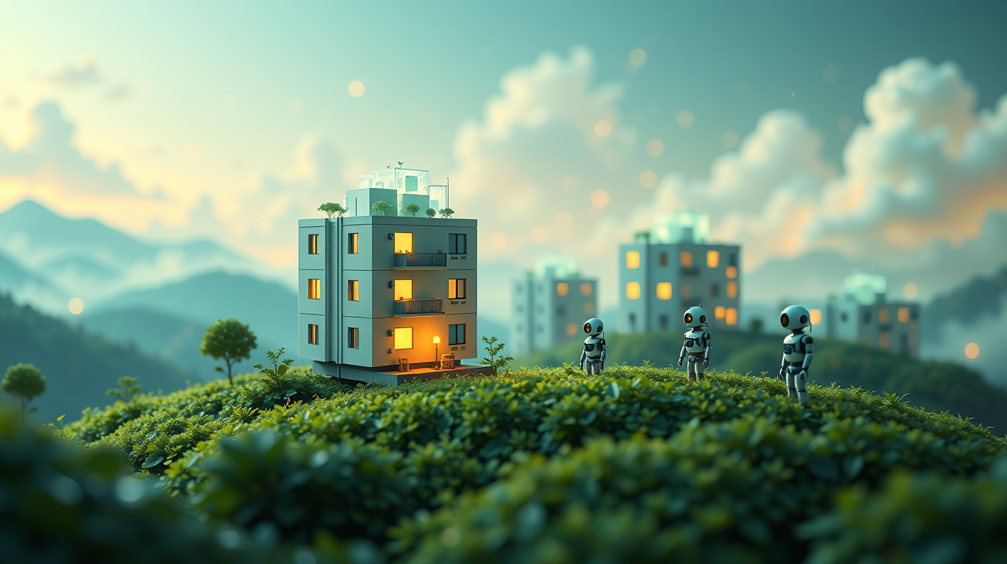 作图提示词:Close-up of small robots glowing softly as they encode memories into bricks and tiles. The scene depicts modular apartments hovering above a lush green landscape, with these robots creating a dreamy holographic projection, evoking a sense of nostalgia. The atmosphere is warm and magical, supported by soft lighting that enhances the peaceful mood.