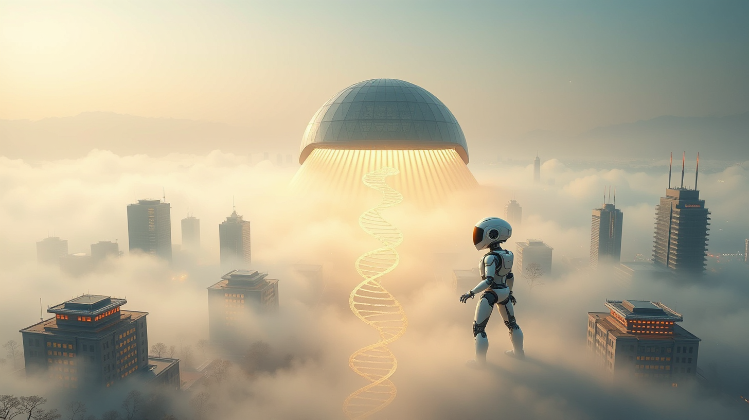 描述:虹桥枢纽的穹顶之下,新生儿的基因序列化作金色的光纹缓缓升起,全城的建筑立面同步显现出对应的图腾,仿佛在为新生命奏响赞歌。清洁机器人在晨雾中穿梭,用细腻的笔触绘制出DNA链状的光轨,那光轨如纽带般,连接着弄堂早餐铺升起的炊烟全息投影,在晨光的映照下,勾勒出一幅生命与科技传承的绝美画卷,充满了神圣与希望的气息。
