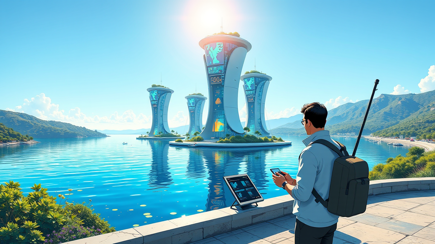 作图提示词:A focused fisherman utilizing an advanced communication device near a futuristic ecological tower, interacting with a holographic interface displaying environmental data. The scene captures the serene beauty of Kamides Bay, with the ecological towers reflecting the vibrant blue waters under the morning sunlight, creating colorful reflections. A panoramic view emphasizes the harmonious integration of cutting-edge architecture with lush natural surroundings.