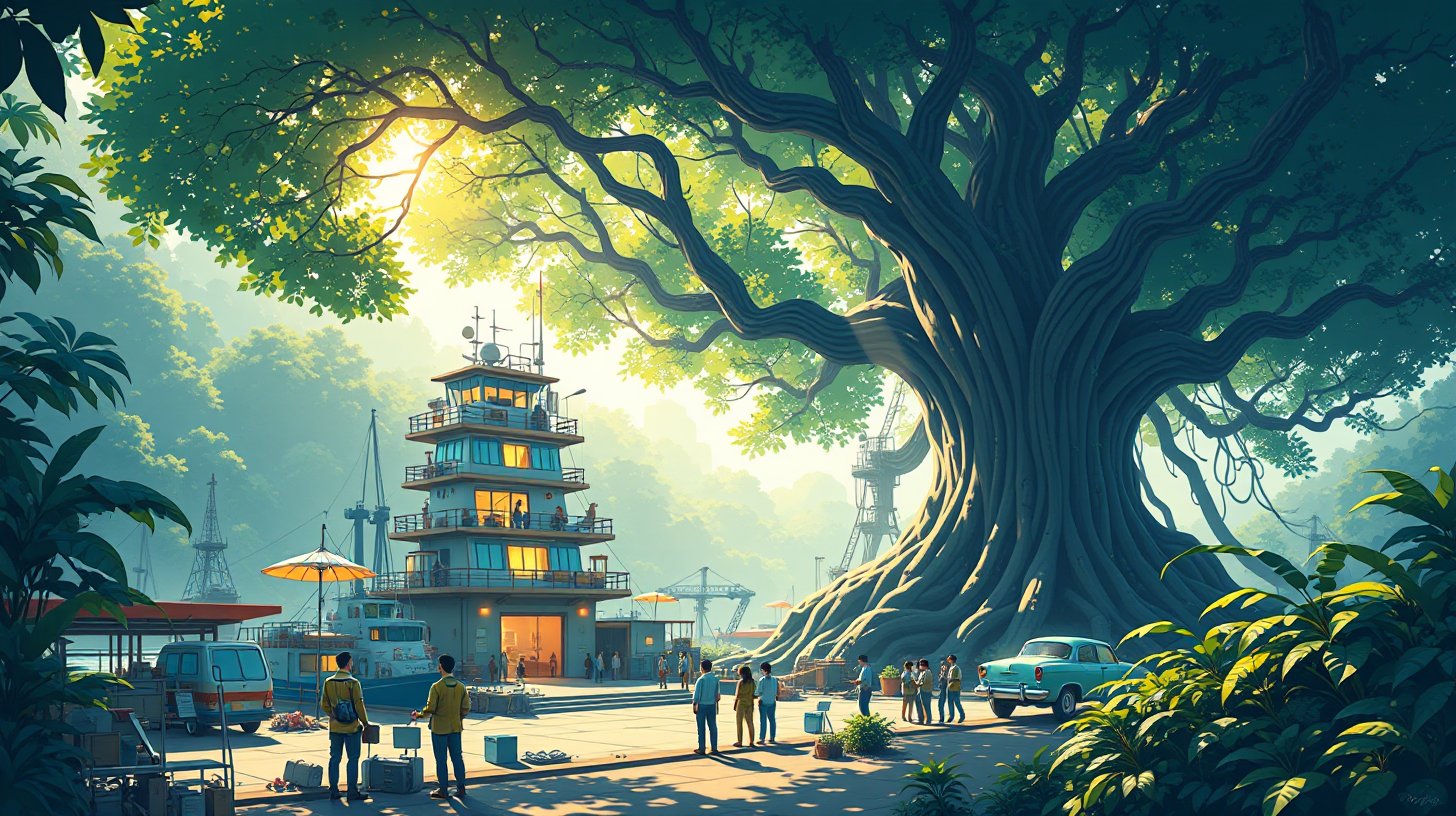 作图提示词:A wide-angle view of a bustling port nested beneath the expansive canopy of a historic banyan tree, where crew members thoughtfully interact with their surroundings, exploring innovative methods for enhancing docking systems. The control tower softly glows from within, suggesting a fusion of technology and nature’s wisdom, while dappled sunlight breaks through the foliage, creating an enchanting atmosphere of curiosity and innovation.