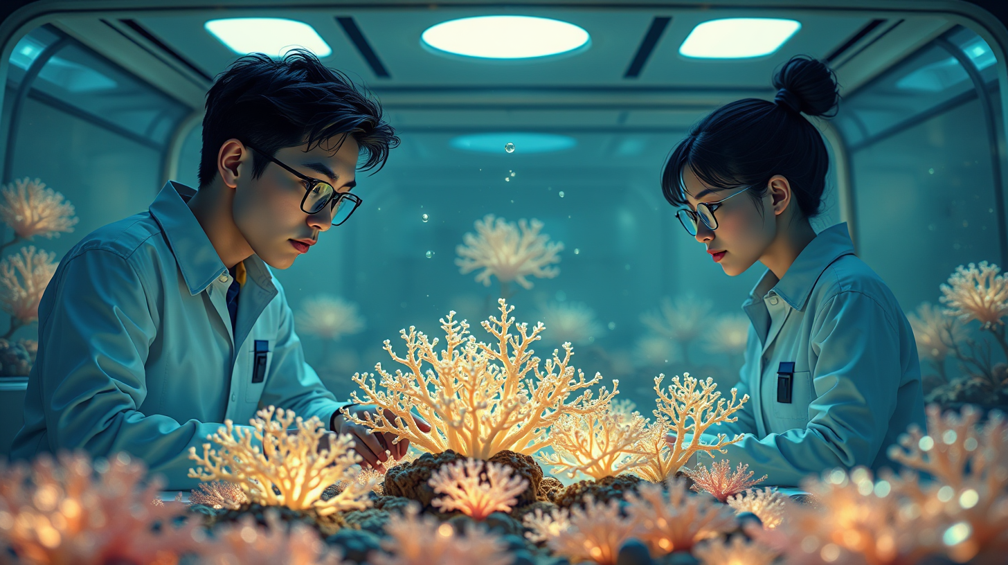 作图提示词:Marine architects working intently within a state-of-the-art bio-ecosystem chamber, observing the intricate behaviors of bioluminescent nano coral species. A close-up shot highlights the delicate, glowing movements of these creatures, immersed in a soft ambient light. An intimate perspective enriches the experience, creating a magical atmosphere that illustrates the groundbreaking innovation in marine biology.
