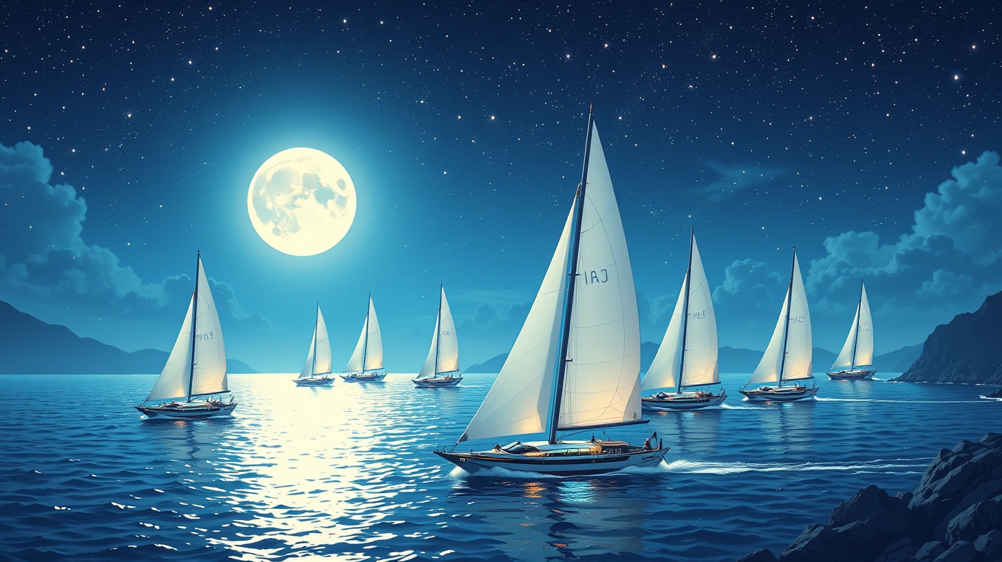 作图提示词:A breathtaking night view of elegant sailboats gliding over a radiant ocean, illuminated by moonlight, with a background of twinkling stars. The boats showcase a blend of futuristic design and traditional maritime elements, echoing a sense of hope and nostalgia. Captured from an aerial perspective, the scene embodies a vibrant festival atmosphere where nature and technology harmoniously coexist.