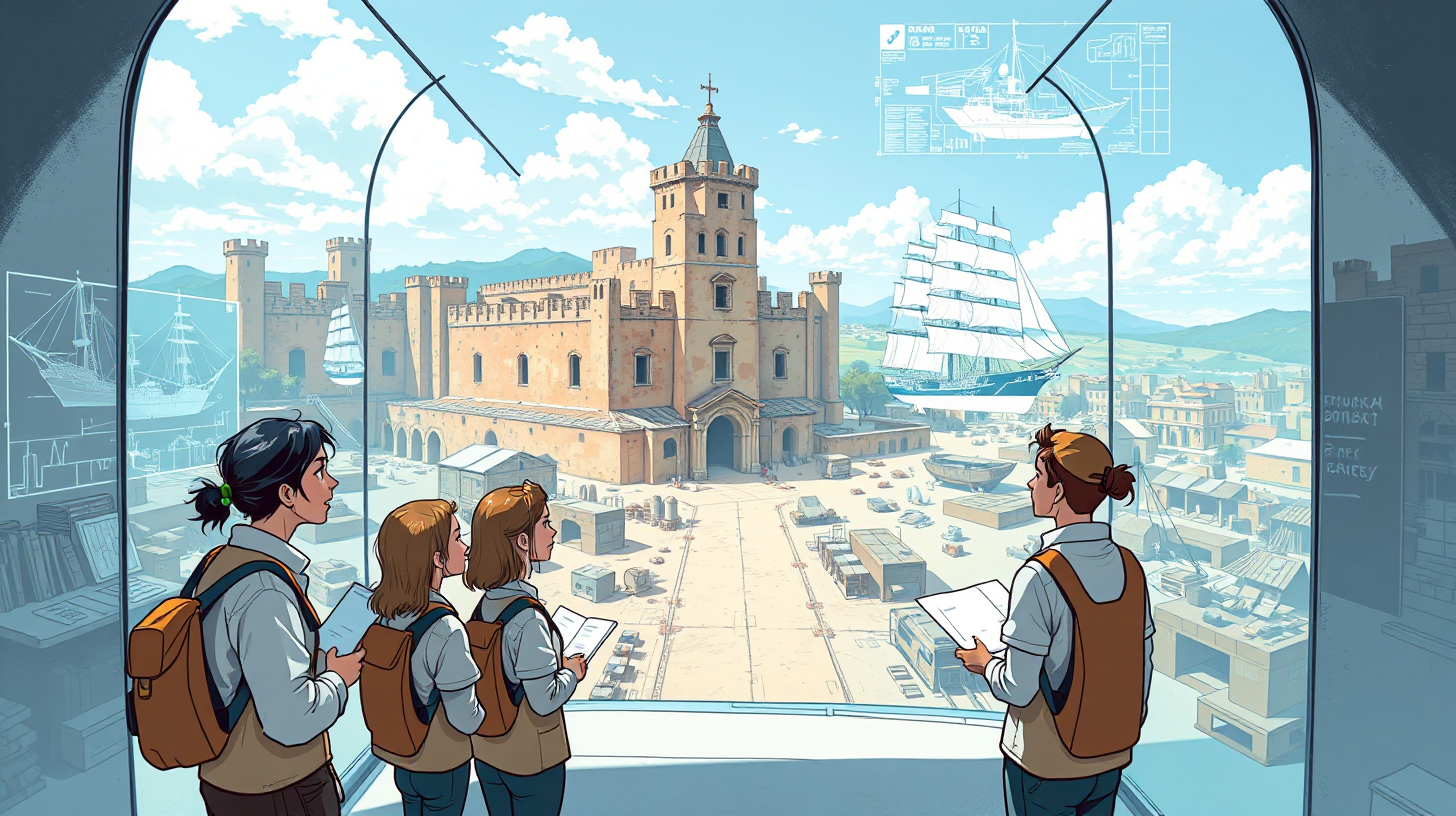 作图提示词:Apprentices studying holographic shipbuilding blueprints in a high-tech transparent corridor, stopping to discuss enthusiastically. The focus captures their engaged expressions as they interact with the modern shipbuilding designs projected around them. An aerial view highlights the connection between the historical Spanish castle ruins and the contemporary shipbuilding workshop, showcasing the fusion of past and future.