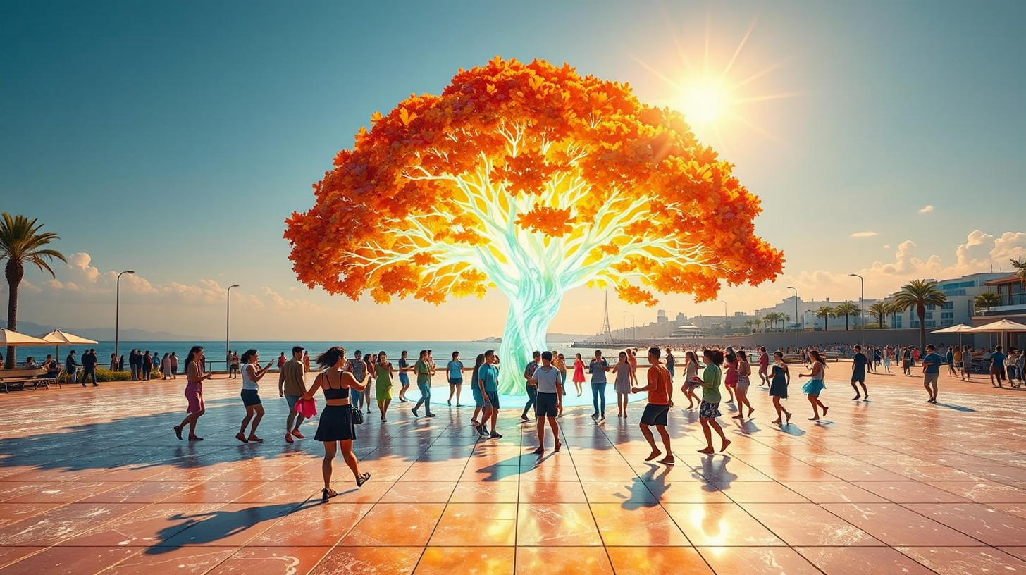 作图提示词:A vivid holographic tree in a coastal plaza, adapting its branches according to the rhythmic movements of citizens dancing beneath it. The scene captures the lively energy of group dances on piezoelectric tiles that shimmer under the bright sun. A midshot reveals the engaging interaction between this advanced technology and the joyful expression of community members, representing a seamless blend of nature and innovation.