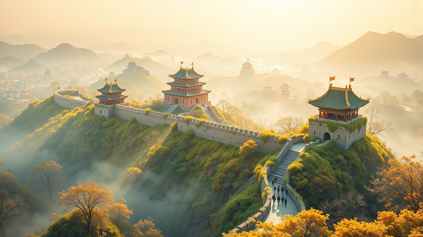描述:晨光如薄纱般笼罩着西安古城墙,纳米修复金纹在城砖表面潺潺流动,宛如历史长河在时光中静静流淌。砖缝间的量子苔藓敏感地捕捉着行人的情绪,时而绽放出欢快的明黄色,时而流转出宁静的幽蓝色,与古老的城墙形成奇妙的呼应。考古型机器人专注地将唐三彩碎片转化为全息历史投影,那些尘封的历史场景与空中悬浮的发光程序诗相互交织,仿佛在诉说着过去与未来的对话,营造出一种时空交错的梦幻氛围。
