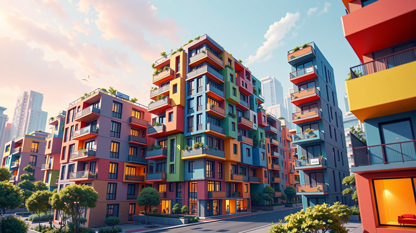 作图提示词:A close-up view of modular apartments in Qujiang New District, dynamically reshaping like a living Rubik’s cube, depicting innovative urban life with vibrant colors, energetic mood, and dynamic lighting that highlights the architectural marvel.