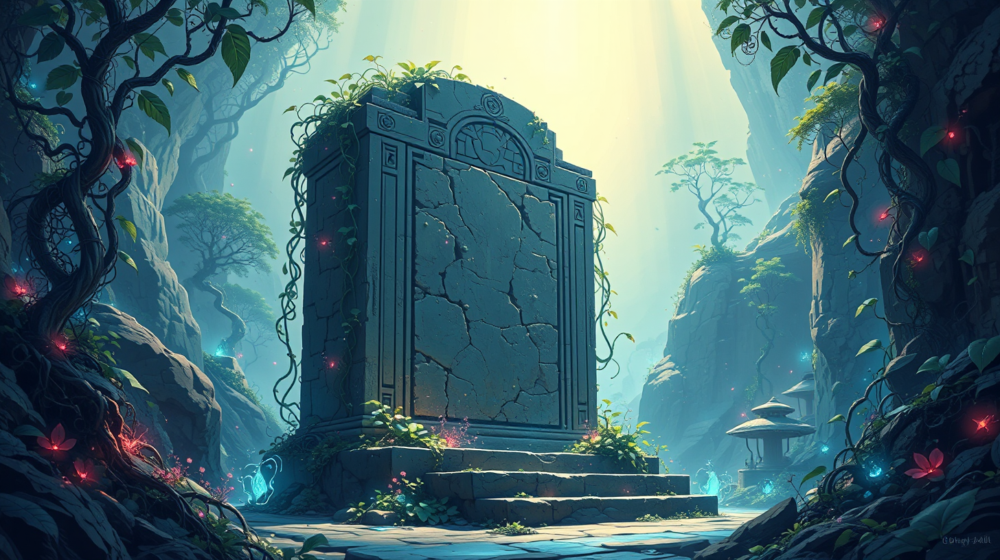 作图提示词:An ancient stele surrounded by luminous, ethereal vines, intricately detailed, bathed in soft ambient light from above, illustrating the harmonious fusion of ancient culture and futuristic technology, with vibrant bioluminescent colors contrasting against the weathered stone, creating a surreal and mystical atmosphere.