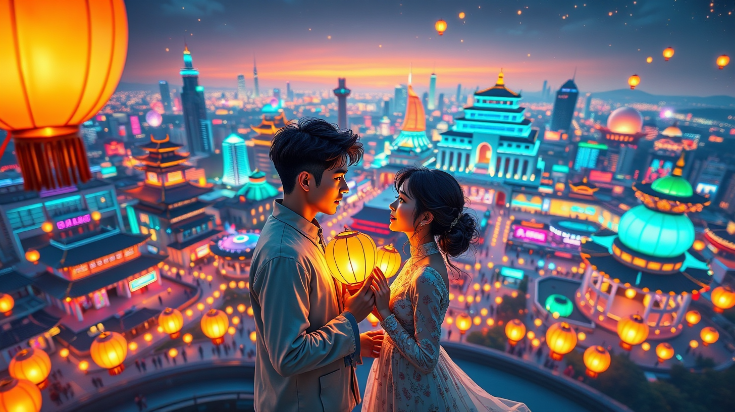 作图提示词:A panoramic view of a futuristic Xi’an, brightly illuminated by vivid bioluminescent lights, featuring citizens gracefully holding Tang-style lanterns casting soft, warm glows, evoking a joyous atmosphere where history and modernity intertwine, the cityscape resembling an enchanting blend of advanced architecture and ancient culture, captured from an aerial perspective to highlight the vibrant colors and dynamic energy. they are gazing into each other’s eyes.