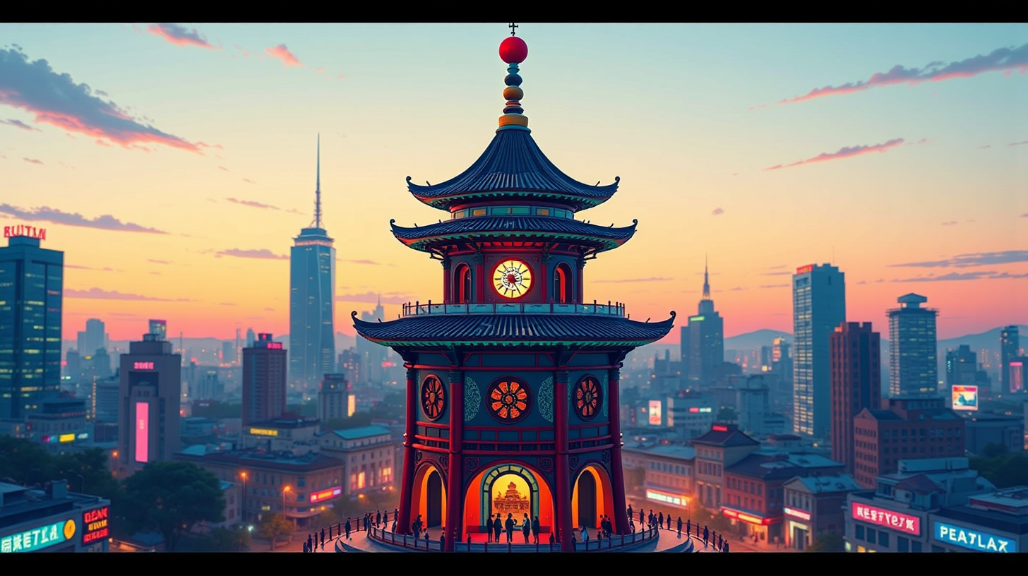 作图提示词:A close-up of the Drum Tower, pulsating with the collective emotions of the city, set against a vibrant urban backdrop during twilight, showcasing bright colors and dynamic lighting that uplifts the mood, emphasizing its role as the heart of civilization.