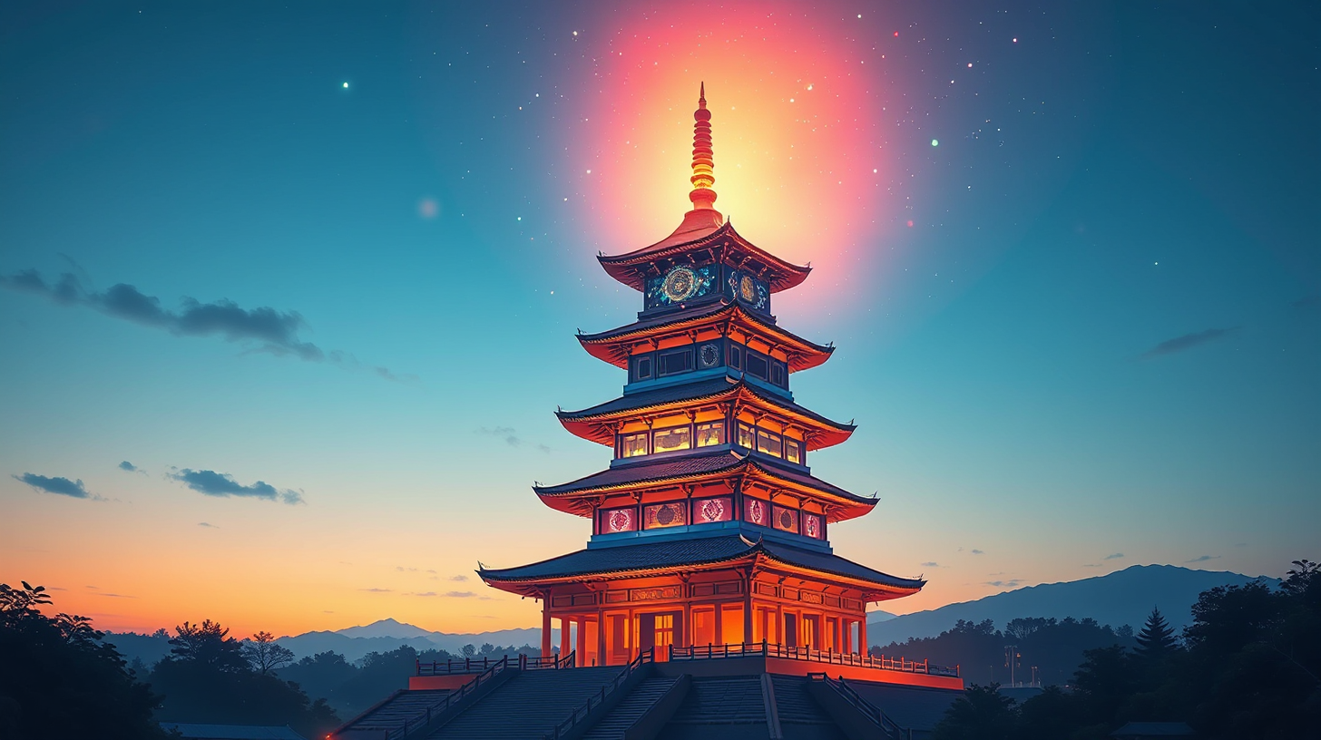 作图提示词:A mid-shot of the Big Wild Goose Pagoda at dusk, illuminated by a projection of ethereal lights depicting cosmic themes, while dark matter imagery softly glows from the top, enveloping the pagoda in a mystical atmosphere, enhanced by vibrant colors and soft, ambient lighting.