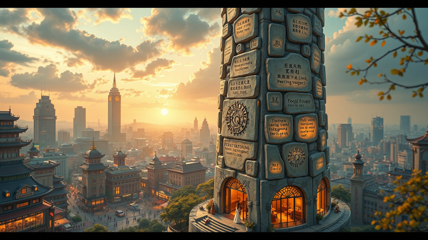 作图提示词:An intimate close-up of the exterior of Erqi Tower, featuring intelligent oracle bone pieces that illuminate and display flowing poetic verses. The bustling city surrounding it reflects a tranquil ambiance, enhanced by soft, warm light and the fresh scent of essential oils, creating a harmonious and serene urban environment.