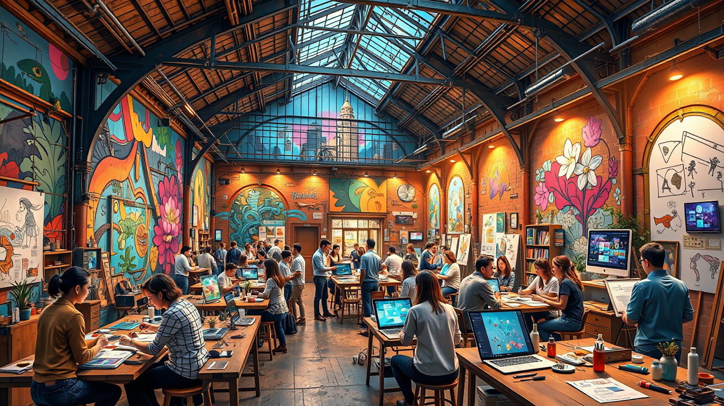 作图提示词:A contemporary renovation of an old railway hub turned public creative space, vibrant murals and cutting-edge technological installations adorn the walls. Artists are passionately collaborating in a lively atmosphere under warm, golden lighting, symbolizing the fusion of art and technology in modern urban life.