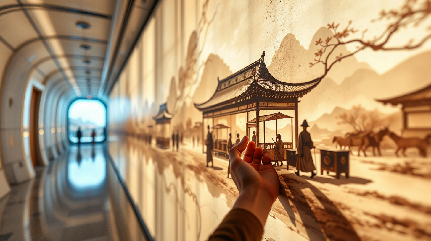 作图提示词:A detailed close-up shot of a hand gently tracing a sleek surface in a futuristic corridor, which triggers an interactive display bringing to life a stunning scene of a Northern Song Dynasty caravan. The wall emanates historical lights and shadows, fusing past narratives with cutting-edge technology to create a mesmerizing, immersive experience.