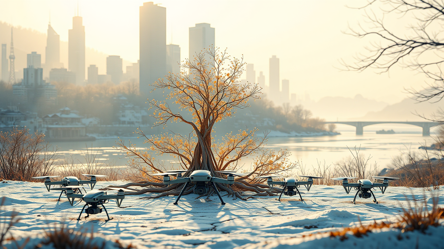 作图提示词:A serene wintry morning scene featuring maintenance drones gathering in front of the Yellow River ecological simulator, warmly illuminated by soft, ethereal light. Bronze particles weave into a protective root network for the city, while the majestic Yellow River flows gracefully in the background, representing the themes of resilience and technological renewal in a harmonious blend with nature.