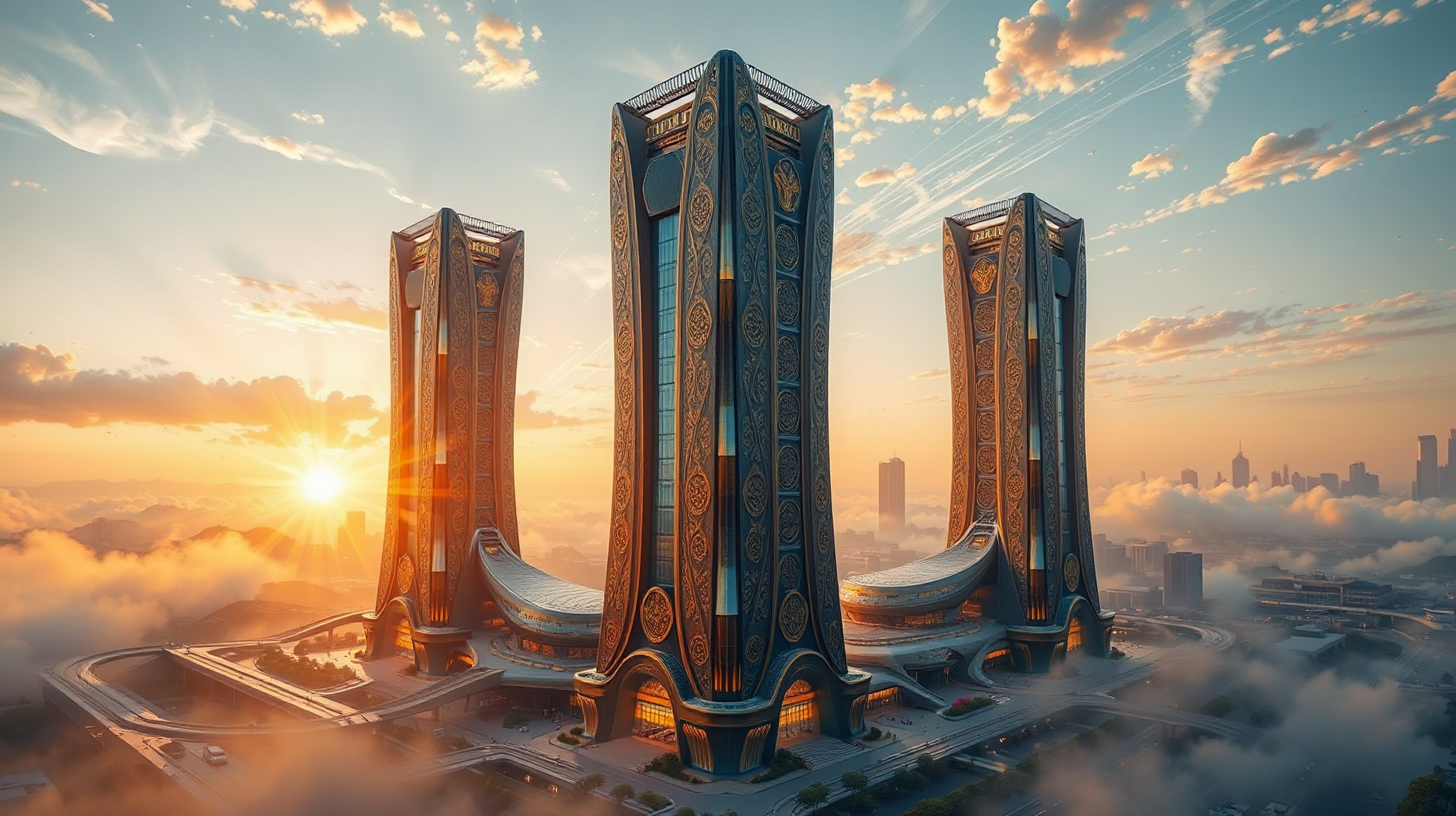 描述:郑州量子物流中心拔地而起,其建筑外观以商代青铜器纹路为灵感,独特的纹路仿佛承载着历史的厚重。每日黎明,枢纽塔顶部的拓扑结构便会幻化成司母戊鼎的形态,金色的阳光洒下,悬浮的青铜粒子在建筑间穿梭,编织出如梦如幻的光轨网络,这些光轨还向全城播撒具有文物修复功能的纳米星尘,给城市披上一层神秘而温暖的面纱。