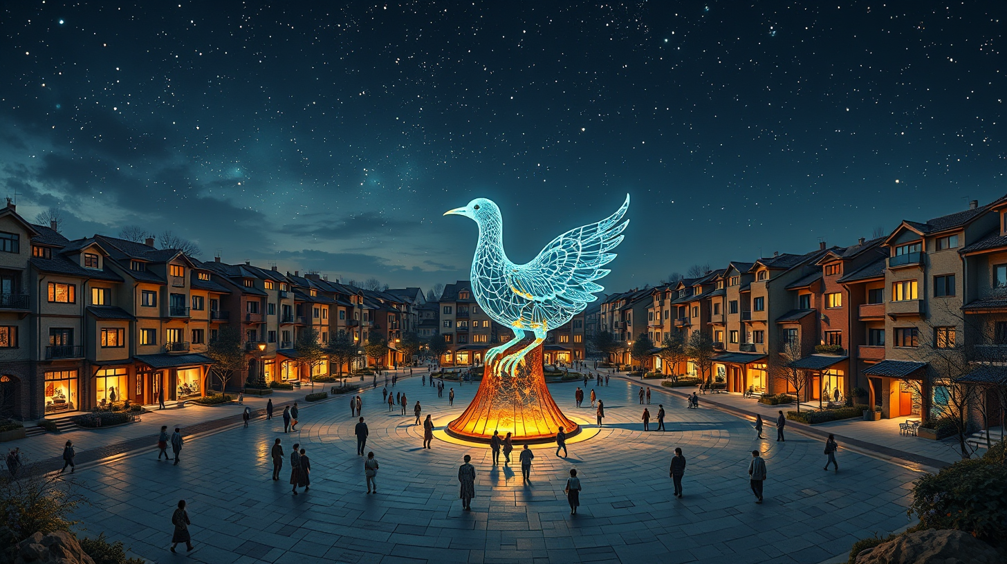 作图提示词:A panoramic view of a central square in Zhengzhou featuring an empathetic installation that transforms aspirations into a vivid holographic oracle bone bird. Under a starry night sky, the interplay of shadows and lights creates a poetic scene, surrounded by residential buildings crafted from Yellow River silt, representing the deep emotional ties of the community.
