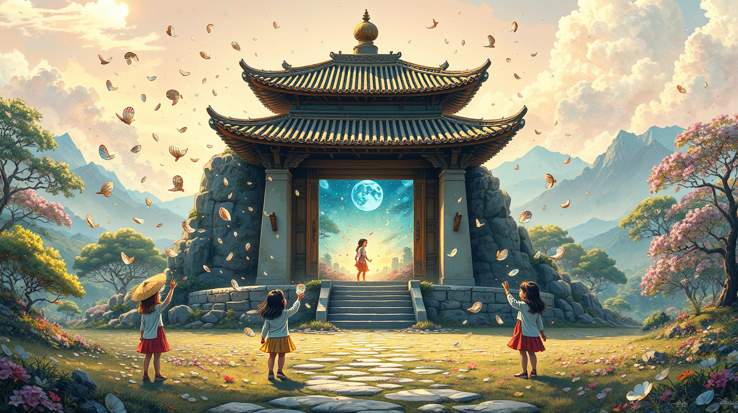 作图提示词:Children delightfully toss shimmering shells filled with their wishes at an ancient monument, which transforms into the shape of a traditional teahouse. Holographic displays of beloved songs from two nations emerge, filling the scene with laughter, creating a magical ambiance that reverberates across the tranquil landscape.