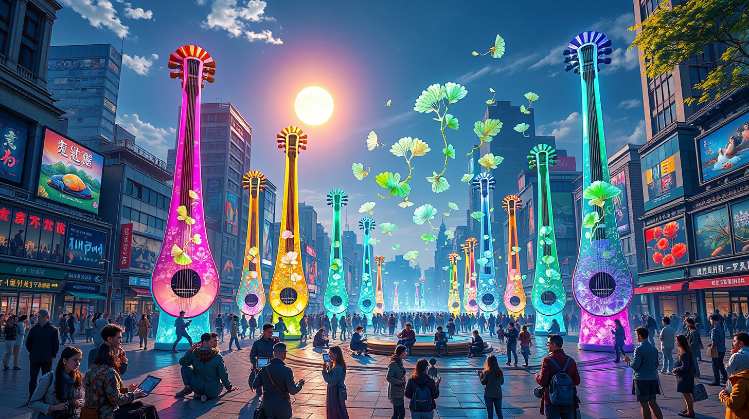 作图提示词:In a bustling city center, vivid light pillars resembling musical instruments stand tall beneath the sun, casting colorful reflections. Citizens gather around, playing the guqin, as holographic characters of Ginkgo leaves dance in the air, creating a harmonious blend of tradition and technology in a dreamlike, musical atmosphere.