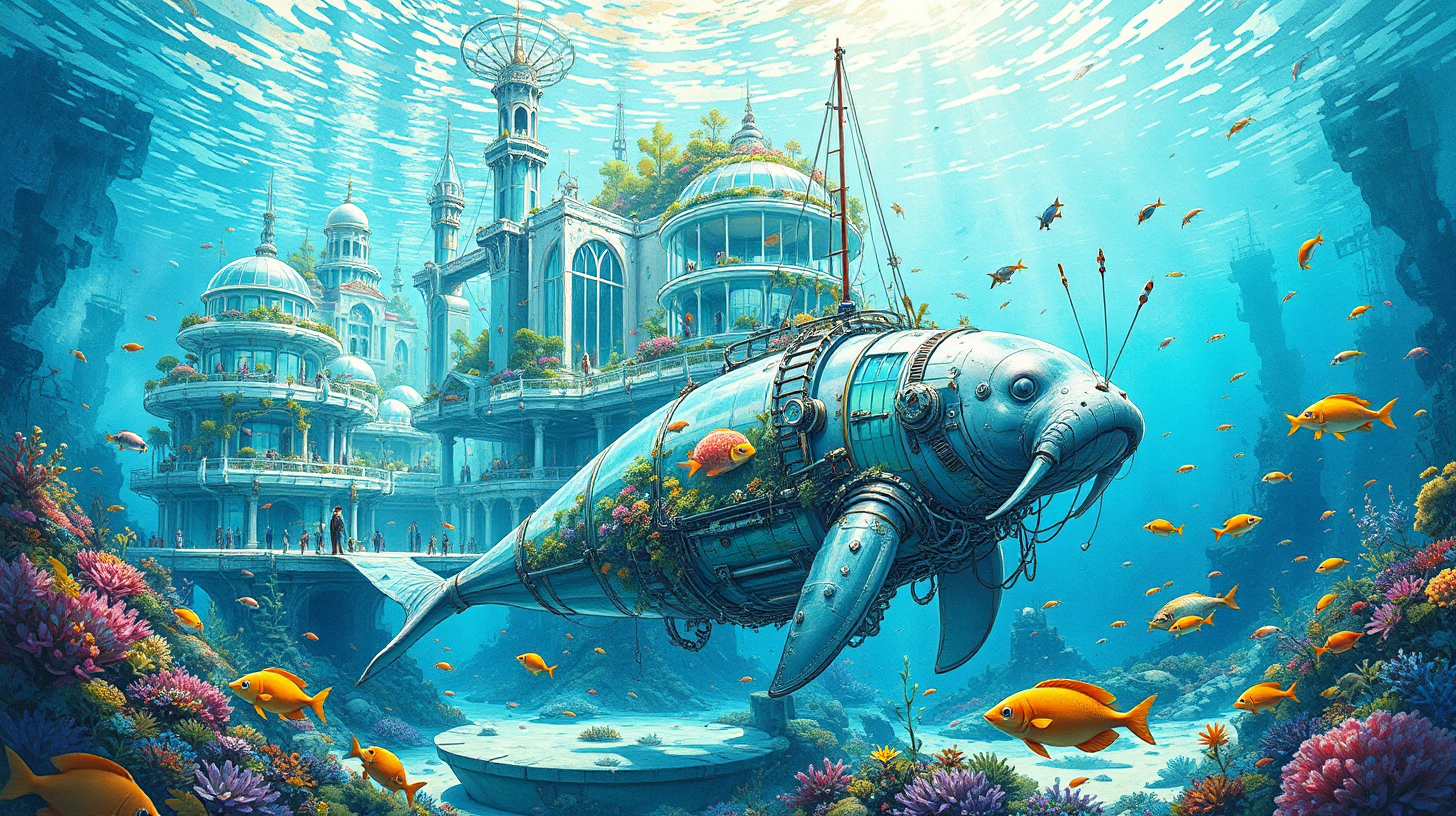作图提示词:Beneath the sunlight, a semi-transparent underwater architectural complex dazzles in a dreamlike manner. A retired fisherman skillfully maneuvers a mechanical manatee, restoring the ecological balance as colorful marine life frolics around, creating a vibrant, harmonious underwater scene rich with life.