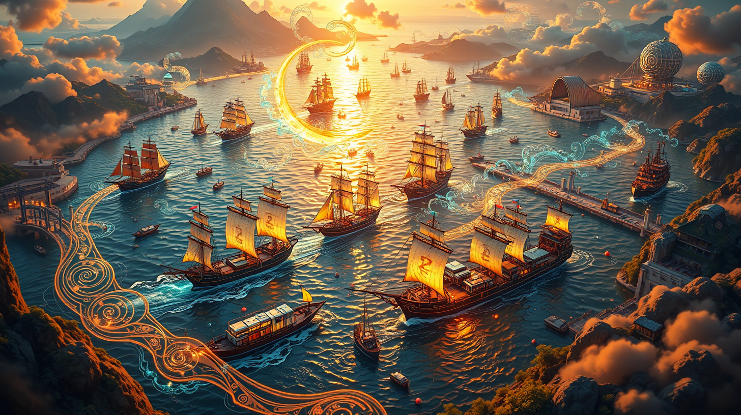 描述:古代海上丝路的航道上方,悬浮着由废弃渔船改造而成的记忆光帆,它们如同历史的守护者,静静地漂浮在蓝天白云之下。当货轮缓缓驶过,光帆便会自动展开,全息投影如同一幅波澜壮阔的历史画卷在眼前展开:明清时期的商船扬起巨大的风帆,与东盟船队在海上相遇,船员们热情地交换着货物,欢声笑语穿越时空传来。现代的船员们站在甲板上,目光专注地凝视着这一切,仿佛与历史中的先辈们产生了心灵的共鸣。船首的共享记忆晶柱闪烁着柔和的光芒,默默记录下这每一个珍贵的瞬间。阳光洒在光帆上,将历史与现实的光影交织在一起,形成了一条连接过去与未来的意识回廊,让古老的丝路精神在新时代绽放出耀眼的光芒。