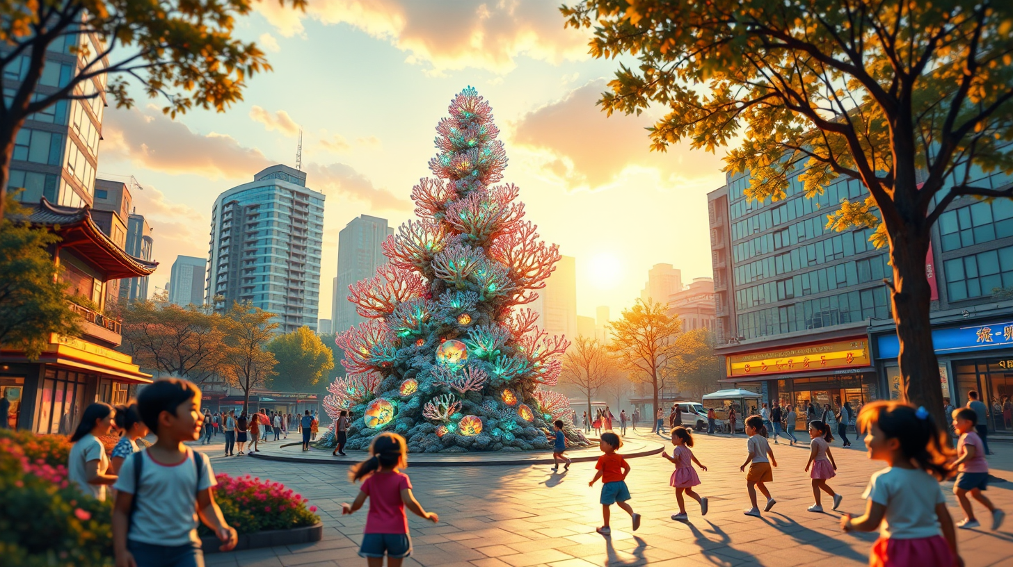 作图提示词:A close-up view of a bioluminescent coral tower in a vibrant city square, warmly illuminated by the sunset. The coral structure mimics the intricate designs of traditional Jing ethnic instruments. Nearby, joyful laughter echoes from children playing, creating a vivid sense of community and continuity amidst an eco-friendly urban environment.