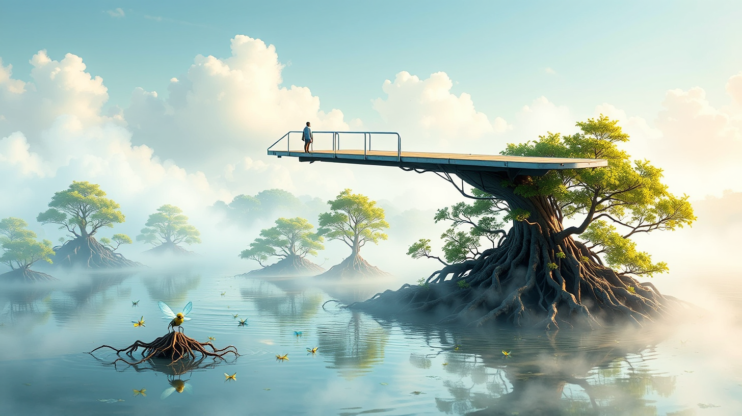 作图提示词:A futuristic dock floating gracefully above a tranquil mangrove, enveloped in morning mist. Tiny nano-repair robots, resembling fireflies, work on the damaged tree roots, while vibrant mangroves shimmer in the soft morning light, balancing nature and cutting-edge technology.