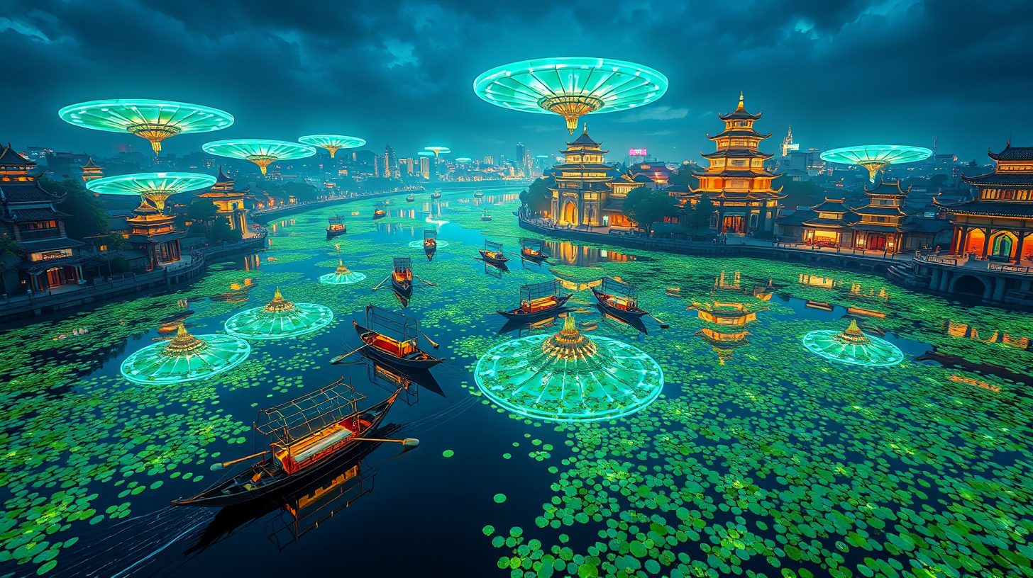 作图提示词:Nighttime along the Qinhuai River where jade disc-shaped resonance fields hover above the water and intelligent oars create data ripples. Neon-lit traditional boats glide through glowing algae blooms, shot from a bird’s-eye view to capture fractal light patterns merging with classical architecture reflections, using a color scheme of peacock blue and liquid gold.