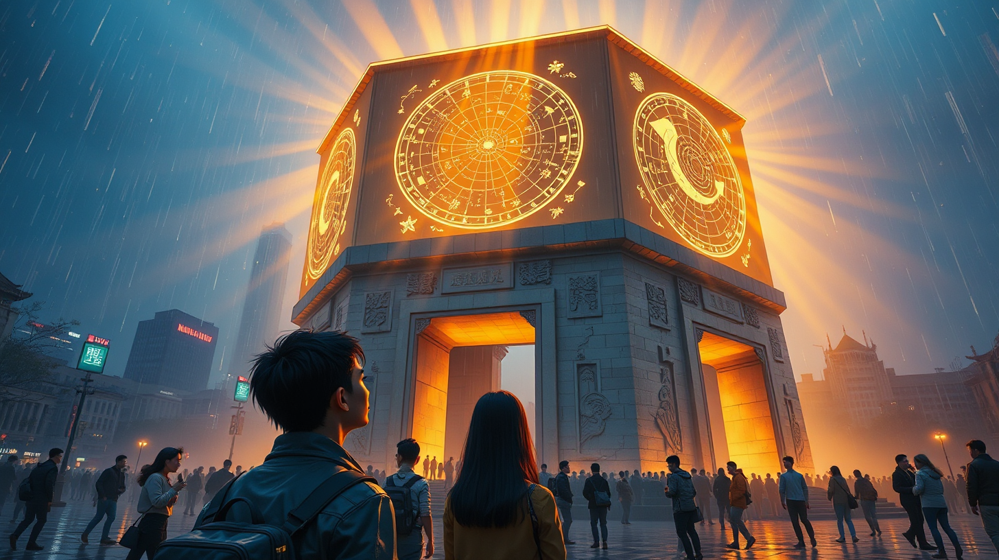 作图提示词:A majestic hexagonal illumination monument stands in a vibrant Nanjing city square, emanating a warm golden light that softly envelops the surroundings at twilight, with intricate star maps holographically displayed in the air, echoing celestial migration patterns. Contemporary Chinese citizens look up in awe, their faces illuminated by the monument’s glow, while suspended raindrops refract the light, creating a beautiful prismatic effect. The scene is captured from an ultra-wide angle at a low vantage point, highlighting the grand scale of the monument, harmoniously blending cyberpunk aesthetics with traditional stone carvings, enhanced by volumetric lighting as beams pierce through the mist, all within a rich golden hour color palette with deep sapphire shadows.