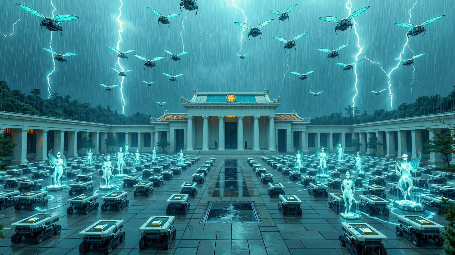 描述:暴雨如注,中山陵的广场上,清洁机器人方阵整齐排列,突然展开羽翼状的金色光伏板,在雨中组成耀眼的光穹。它们严谨地执行护陵任务,收集的雨水在离地三米处凝成悬浮水幕,跳动着《霓裳羽衣曲》的量子乐符。无人机群穿梭在松柏间,机翼抖落的水珠在石象生雕像表面绘出瞬态涟漪,光伏阵列吸收的闪电能量唤醒了沉睡的碑文全息。暴雨中的陵园,庄严的历史建筑与先进的科技装置相互映衬,展现出一种独特的仪式感,仿佛科技正以温柔的方式守护着古老的文化传承。