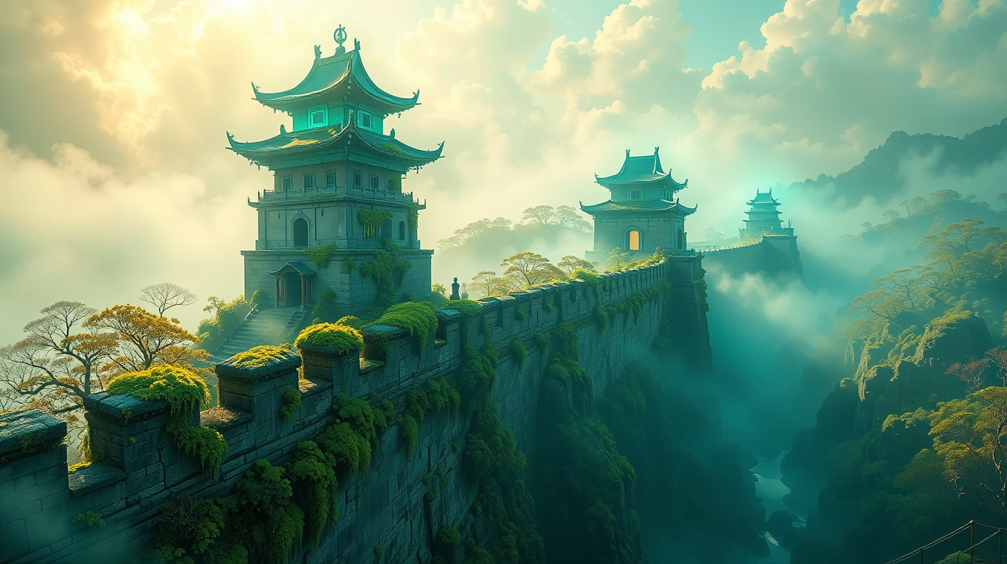 作图提示词:A futuristic visualization of a Ming Dynasty city wall adorned with bioluminescent moss, illuminated by the morning mist, where sunlight refracts through fog, creating a prismatic effect. Holographic depictions of historical figures hover above the stone fortifications, combined with intricate details of moss textures and weathered granite, captured from an aerial perspective with cinematic lighting in jade green and antique gold.