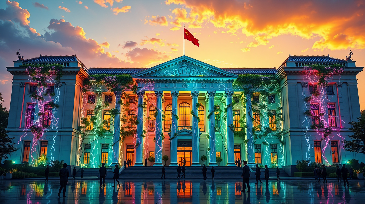 作图提示词:The Presidential Palace at golden hour featuring a bioluminescent facade with dynamic light patterns in flowing emotional colors cascading down neo-classical columns, photovoltaic ivy carrying modern energy solutions, while silhouettes of contemporary figures reflect on smart glass surfaces, balanced composition showcasing the blend of Western architecture and traditional Chinese motifs in a medium shot.