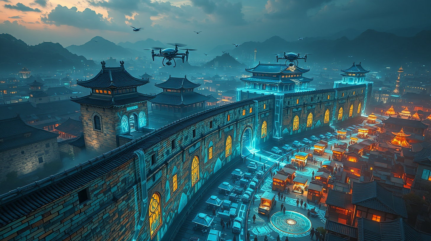 作图提示词:An aerial view of the ancient city wall of Pingyao adorned with weathered cyan bricks, illuminated by advanced quantum light technology, featuring robotic nanorepair drones skillfully enhancing intricate carvings, surrounded by a holographic display of merchant caravans, showcasing cool blue quantum energy flows mingling with warm amber projections of the past, all captured in dramatic chiaroscuro light emphasizing the textural contrast of antiquity and futurism.