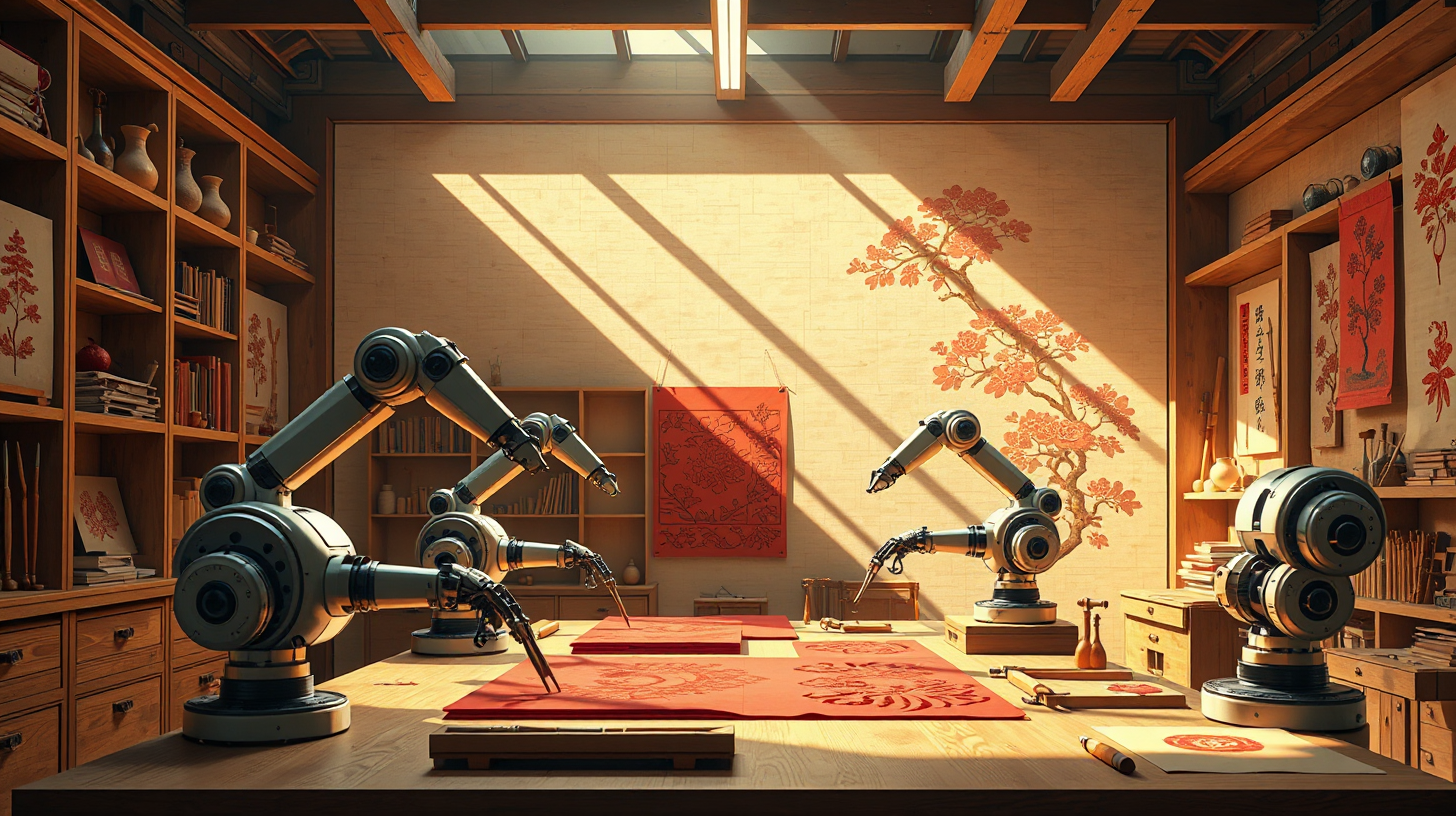 作图提示词:In a warmly lit workshop, robotic arms skillfully replicating intricate Shanxi folk patterns on crimson paper, with traditional papercutting tools arranged lovingly in wooden cabinetry, the light casting delicate shadows of papercuts on rice-paper walls, creating a stunning diagonal composition that juxtaposes the warmth of antique wood against sleek, high-tech equipment.
