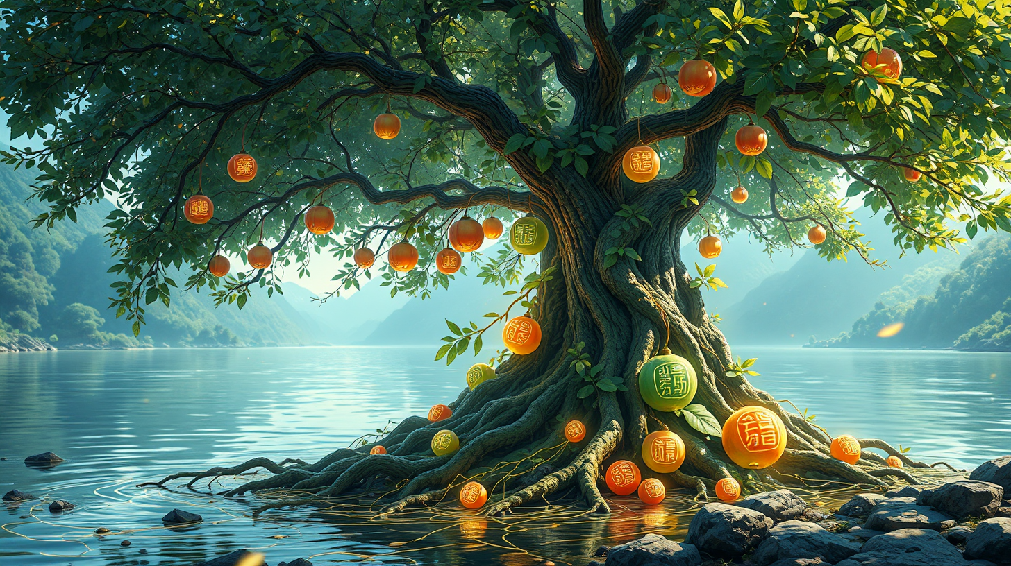 作图提示词:A close-up view of a trading tree beside the Fen River, with luminous roots artistically illustrating historical trade routes intertwined in the water, transparent fruits depicted with glowing merchant seals, capturing the interaction between nature and trade, with soft dappled light filtering through the spectral foliage, enhancing the ethereal quality of the scene.