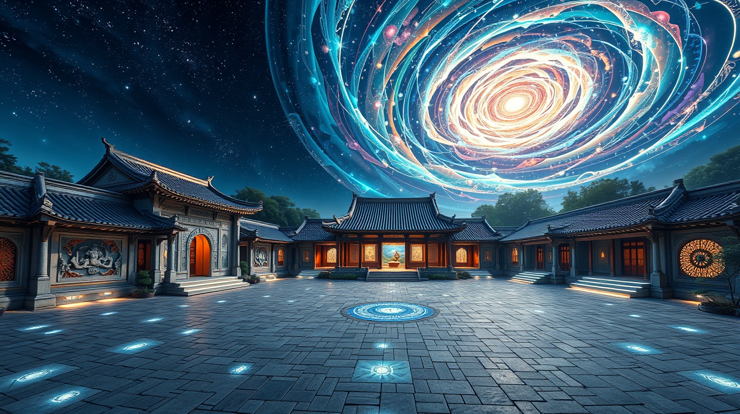 作图提示词:A striking night scene over the historically significant Wang Family Courtyard, where celestial-inspired architecture intertwines with swirling slipstreams of light. The ancient stone carvings radiate with luminous patterns inspired by cosmic phenomena, while prismatic energy nodes pulse rhythmically. Above, a swirling galaxy vortex hovers over a geometric plaza adorned with traditional grey bricks embedded with sleek circuitry. The cool interplay of white and silver lighting, accented by nebula colors, forms an ultra-wide aerial perspective that conveys a sense of cosmic harmony and infinite possibilities in a visionary quantum age.
