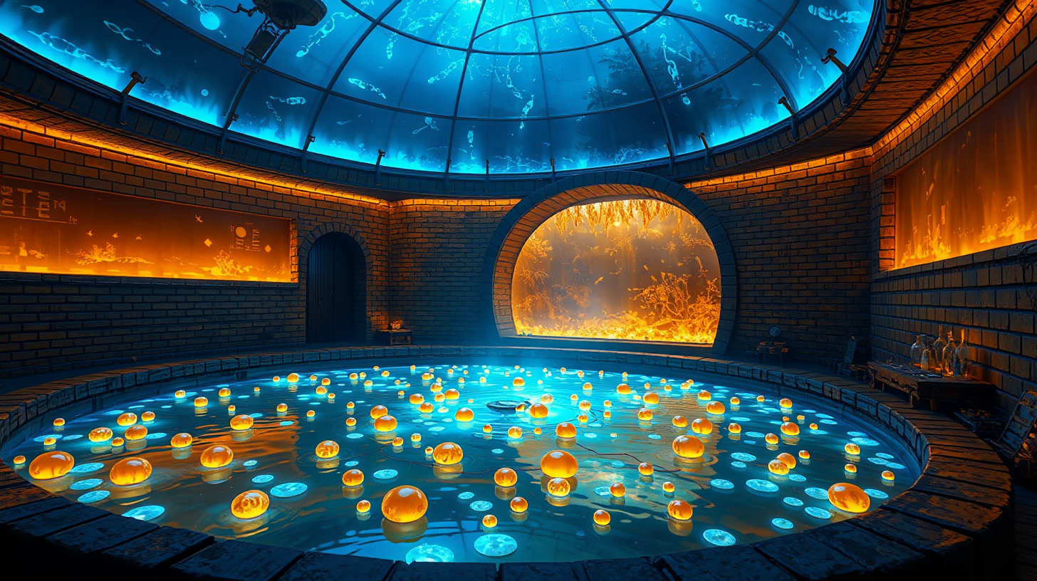 作图提示词:A futuristic representation of an ancient Shanxi vinegar fermentation pool beneath a transparent dome, showcasing bioluminescent bacteria illuminating the space, with amber vinegar capsules gently floating and emitting a soft glow. The setting features traditional brick walls seamlessly integrated with advanced holographic technology, bathed in ambient blue lighting that creates enchanting shadows. The ultra-wide shot captures the detailed interaction between microbial activity and futuristic elements, with rich vibrancy of amber and azure accented by subtle golden tones, presenting a harmonious visual narrative of tradition meeting innovation.