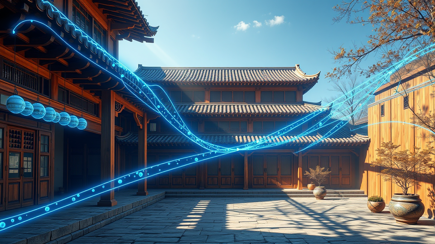 作图提示词:A side view of Qiao Family Courtyard featuring traditional wooden dougong brackets enhancing the architectural beauty, with intelligent abacus beads in glowing trajectories symbolizing the fusion of ancient wisdom and modern calculations, warm amber wood textures contrasting with blue digital paths, with suspended flying eaves casting intricate shadows onto stone flooring, utilizing chiaroscuro lighting to highlight the vibrant details of wood grain.