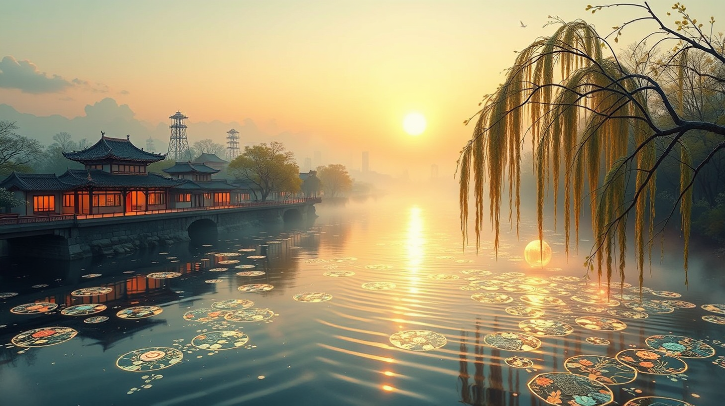 作图提示词:A futuristic river glowing with quantum energy at dawn, reflective Xiang embroidery patterns shimmer on the water’s surface, elegant traditional Chinese architecture with curved eaves lining the banks, holographic flower-drum opera scenes emerging from gentle ripples, soft golden light refracted through prismatic mist, cybernetic willows gracefully dipping branches into the luminous flow, mist merging with nanotech particles, creating a harmonious blend of hexagonal traditional motifs and subtle digital projections.