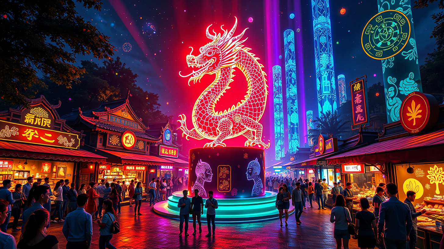 作图提示词:A plasma dragon hologram swirls playfully around the emotion spectrum tower, an augmented reality marketplace buzzing with glowing betel nut patterns, bio-luminescent stalls projecting vibrant cultural symbols, light pillars analyzing crowd emotions in real-time, traditional paper-cut art beautifully fused with neon signage, quantum dots dynamically form poetry in the air, while chromatic aberration enhances prismatic social connections throughout the market.