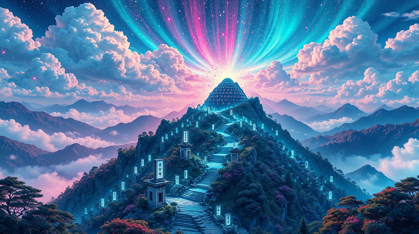 作图提示词:An aerial view of Zhushan summit aglow with a neural network aurora, where citizens’ brainwave collectors create a constellation of luminescent dots scattered across the rugged mountain terrain. Holographic steles display flowing calligraphy that gracefully integrates into the stratocumulus clouds above. Harmonic light waves pulsate with chromatic aberration effects, while ancient stone monuments are intricately embedded with bioluminescent circuits. The scene is a panoramic fusion of a vibrant cybernetic landscape adorned with lush pine forests intertwined with optical fibers, showcasing a cool cyan and magenta spectrum overlaid with diffraction effects.