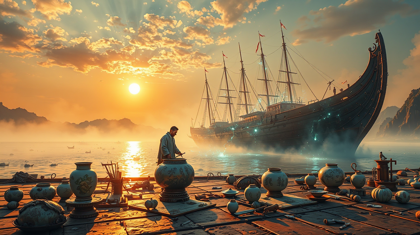 作图提示词:A futuristic reconstruction of an ancient Song dynasty shipwreck, illuminated by the warm glow of sunset. Advanced nanobots are meticulously restoring fragments while digital holograms of craftsmen intricately interact with light particles. The shimmering reflections on the quantum river highlight ceramic remnants, captured from a low-angle view to accentuate the metallic reconstruction beams that pierce through the mist. Aesthetic steampunk archaeology tools are artistically scattered across the dock, infused with a warm amber and azure color palette, enhanced by soft volumetric lighting.