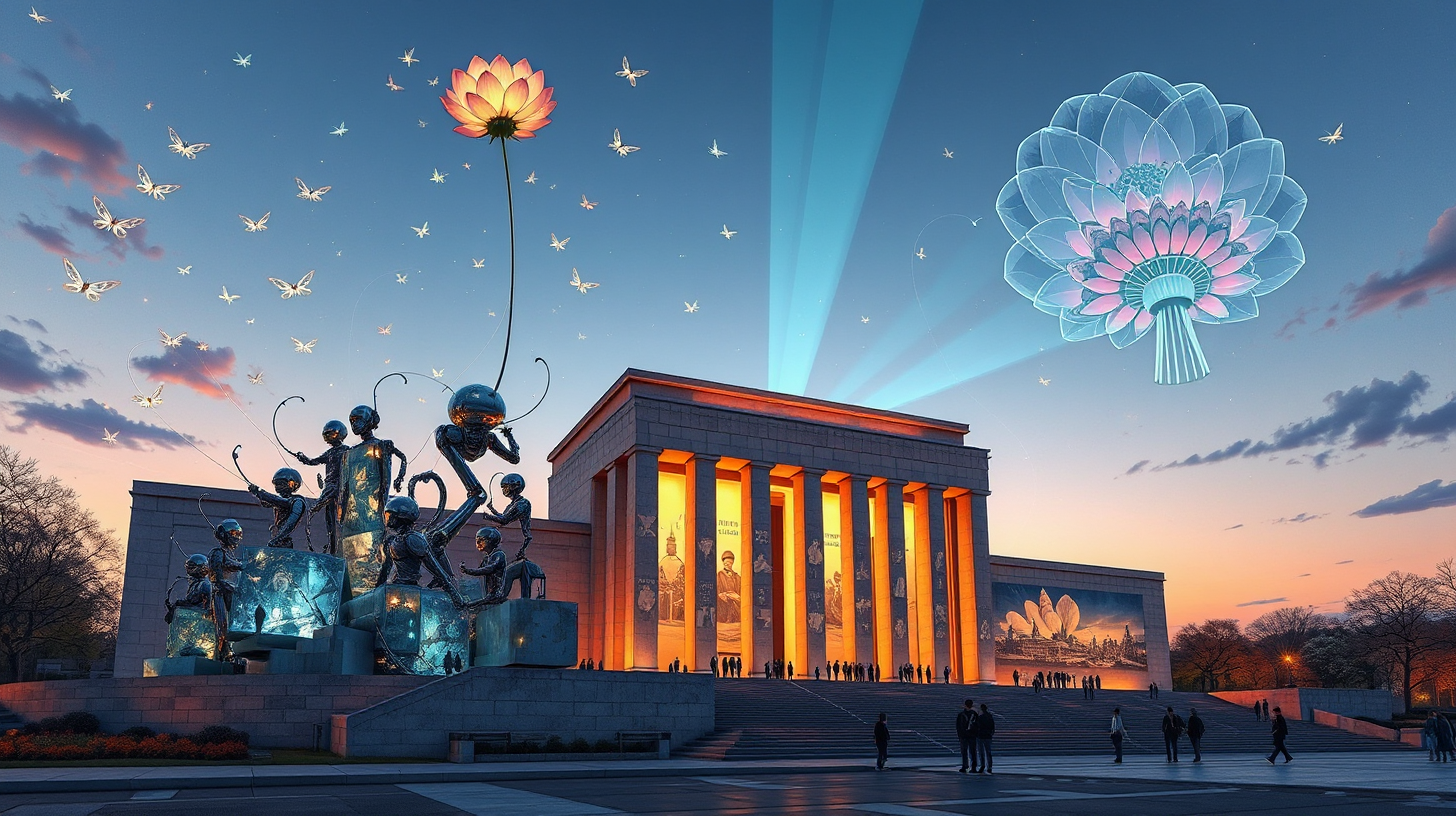 作图提示词:At dusk, a cluster of robotic sculptures reshapes revolutionary scenes, nanobots collaboratively form dynamic memorial structures, holographic fireflies trail plasma light, amber sunset light casts elongated shadows on self-repairing granite, augmented reality projections vividly illustrating historical battles, chrysanthemum-shaped energy shields bloom above the memorial hall, while light refraction creates intricate prismatic historical overlays on neo-classical columns.