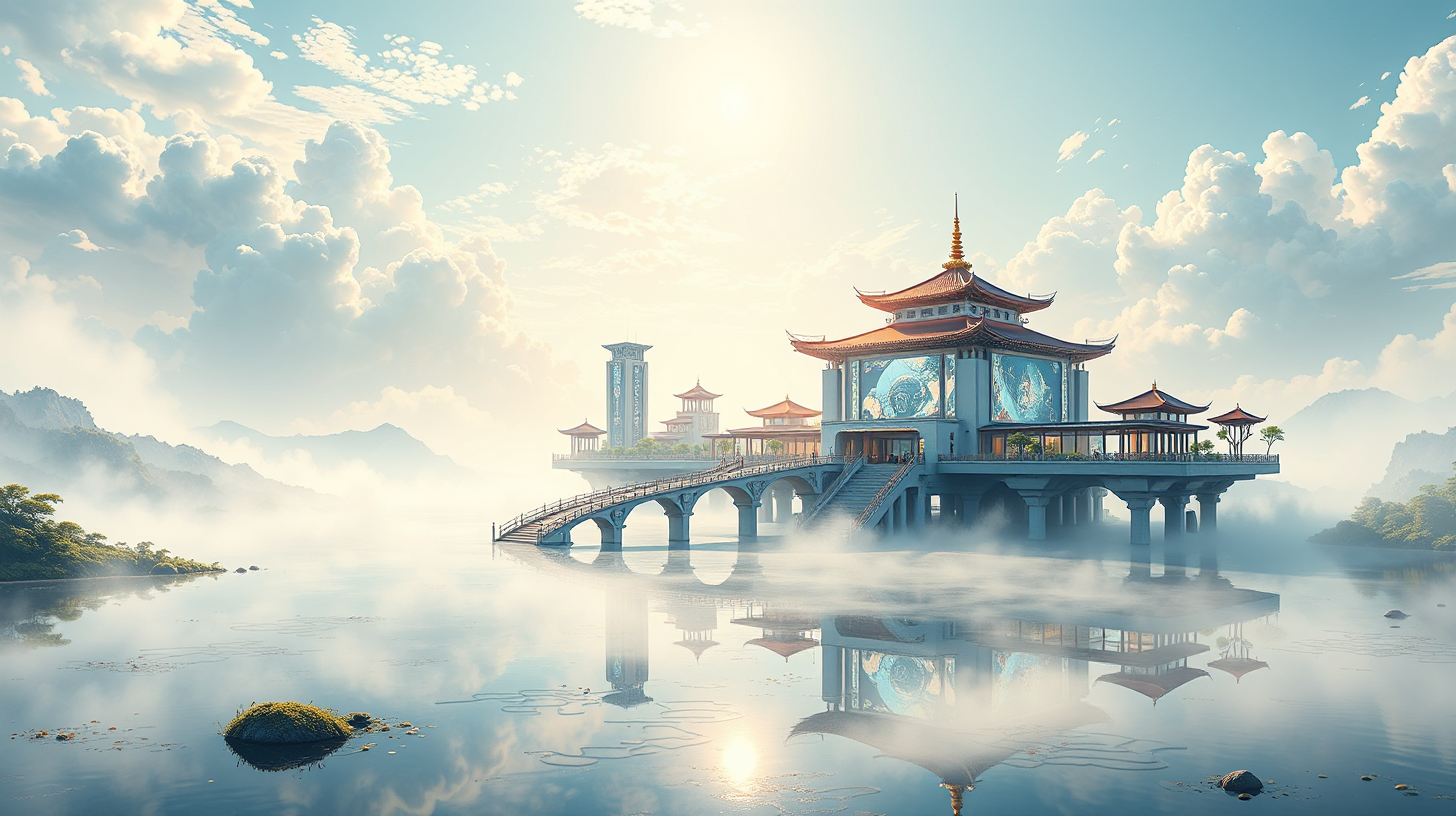 作图提示词:A modular academy gracefully floats above a misty lake, intelligent pillars transforming into fractal patterns as sunlight filters through ethereal cloud-based data clusters, holographic teaching interfaces projected onto the water’s surface, energy bridges elegantly connecting floating pavilions, traditional dougong brackets harmoniously integrated with quantum computing nodes, while refraction patterns create delicate calligraphy shadows on adaptive membranes.