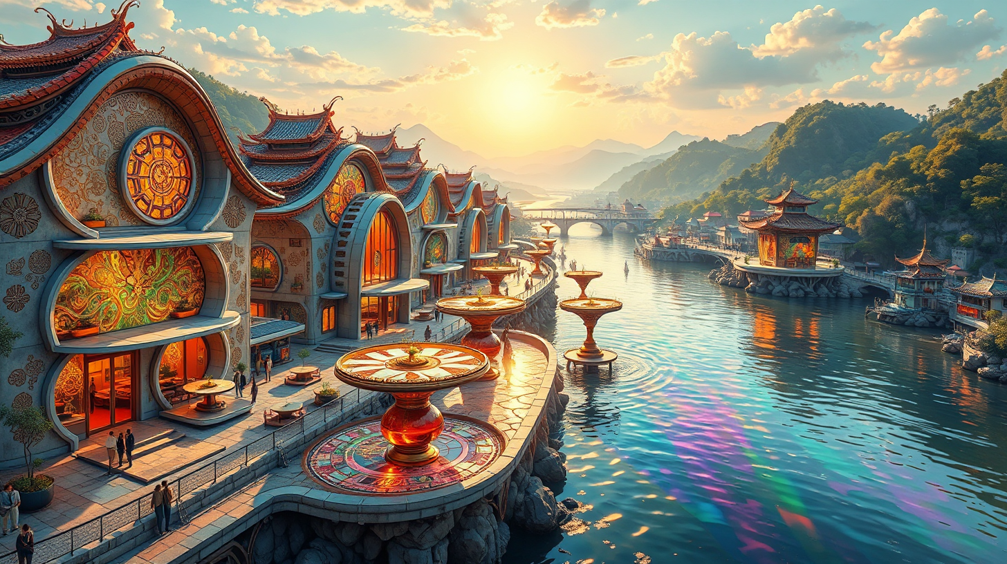 作图提示词:An aerial view of futuristic quantum teahouses along the Jinjiang River, featuring innovative architecture with Shu brocade patterns embedded in the facades, vibrant tea liquid creating holographic fractal patterns above suspended tables, and the river reflecting golden sunlight with prismatic colors, showcasing a blend of cybernetic and traditional styles.
