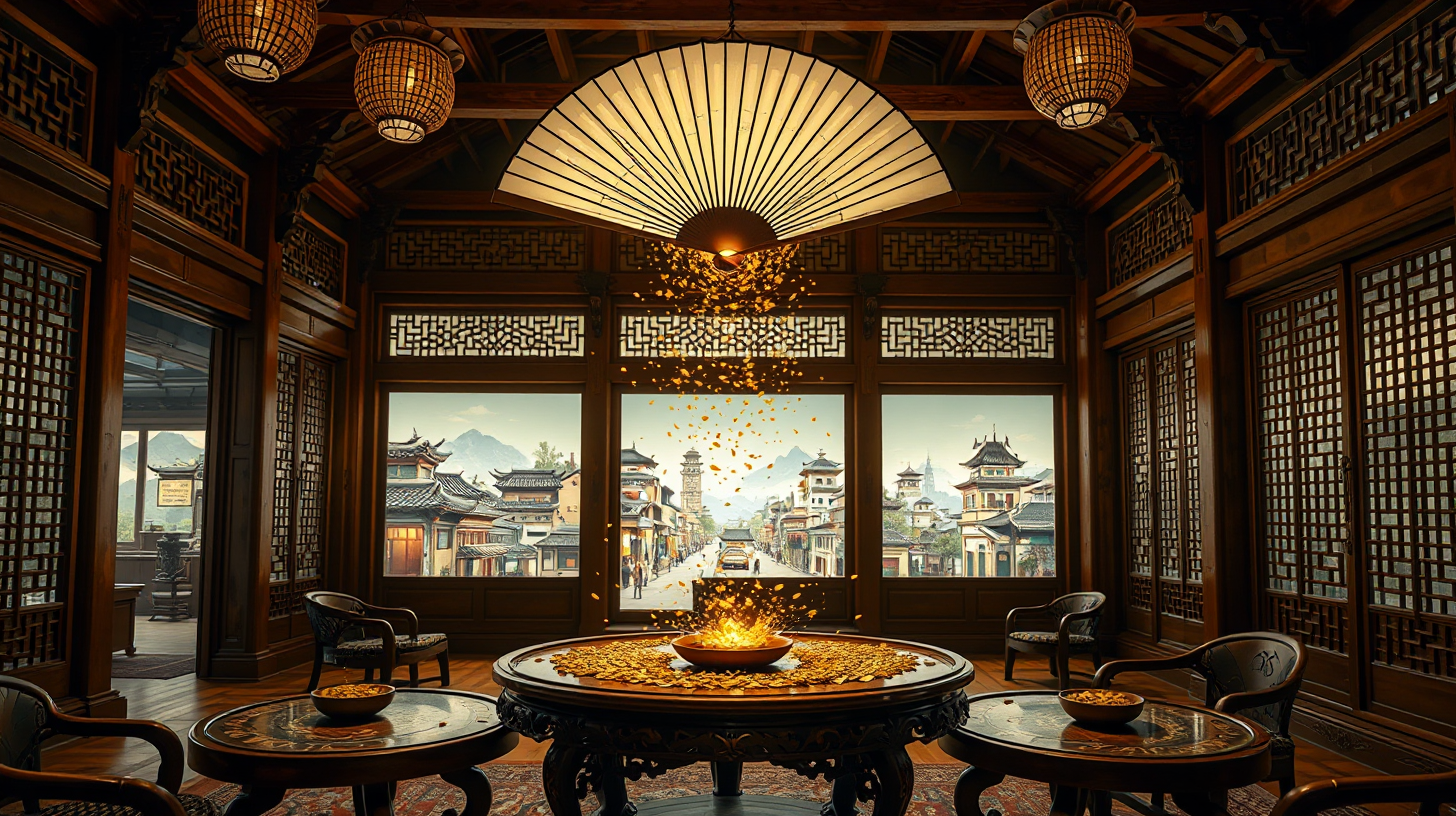 作图提示词:Inside a contemporary Chengdu teahouse showcasing traditional wooden beams and columns, digital projections of historic streets flow across the circular surfaces of antique tea tables. An elegant folding fan hovers above, releasing glowing historical particles. Warm amber lighting bathes floating tea leaves, while intricately carved wooden window screens filter augmented reality cityscapes. Front view captures the layered depth of cultural heritage, with golden particle effects merging with pixelated visuals of Republic-era architecture.