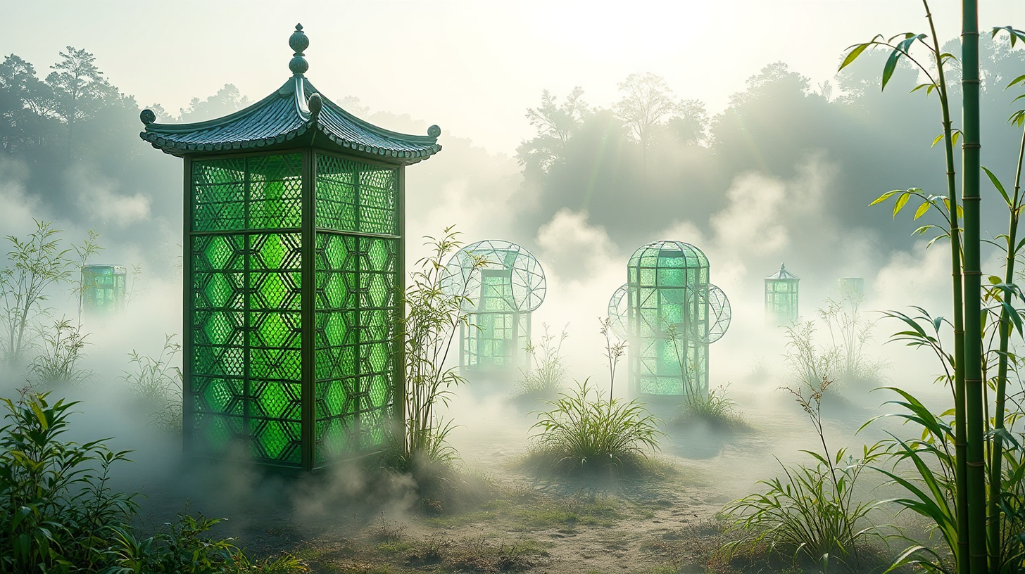作图提示词:A side view of intricate bamboo artworks shrouded in morning mist at Huanhuaxi Park, where gentle light reveals rainbow diffraction through crystalline bamboo fibers, and traditional weaving patterns harmonize with modern parametric design created in glowing green filaments, presenting an ethereal ambiance of cyber-naturalism.