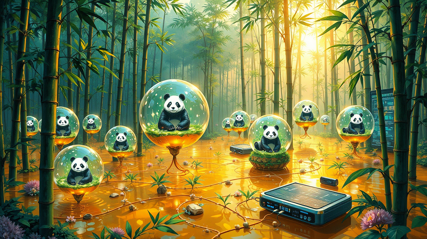 作图提示词:A medium shot of a vibrant bamboo forest biosphere, where transparent ecological pods housing glowing panda holograms float gracefully in a golden gel medium, interconnected by neural interface tendrils leading to bamboo-shaped servers, with warm ambient light filtering through prismatic energy membranes, illustrating advanced conservation technologies in a harmonious ecosystem.
