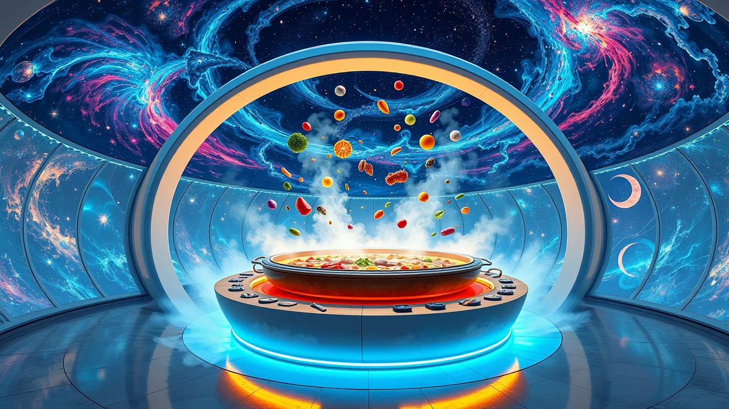作图提示词:A futuristic hot pot restaurant designed like a sleek, circular structure inspired by particle accelerators, set under a starry night sky in Chengdu, with holographic nebula projections swirling around it. Ingredients appear to float in mid-air, suspended by advanced gravitational wave technology, while neon-blue lights illuminate the simmering broth. Aerial perspective emphasizes the circular symmetry and vibrant contrasts between the cosmic visuals and the warm, golden steam of the hot pot.