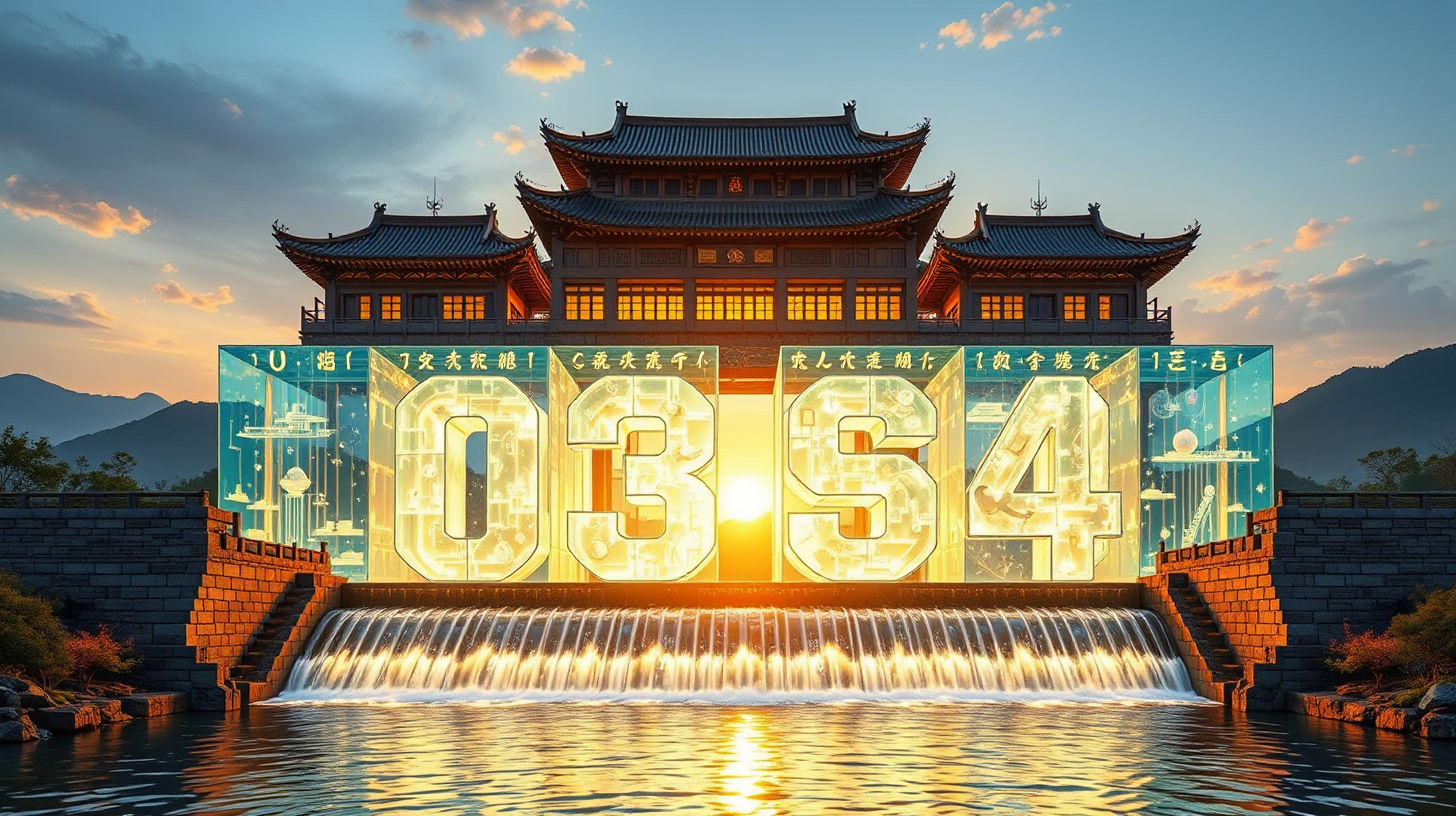 作图提示词:A front view of the Dujiangyan water control system at sunset, highlighting the seamless integration of ancient stone weirs with cutting-edge transparent aqua-cube structures, where luminous liquid numerals flow gracefully, illuminated by golden hour light refracting through a cascade of prismatic water curtains, embodying a fusion of cybernetic aesthetics with Han dynasty architecture.